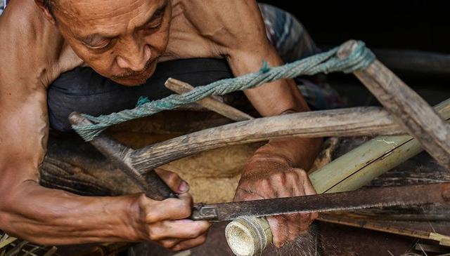 在李佰洲家的院子里,摆满了各种各样的工具和生活用品,锯子、刨刀、磨刀石等等。几十年过去了,一根根竹子在门槛上拖来拖去,磨出了一道油光发亮的凹槽。